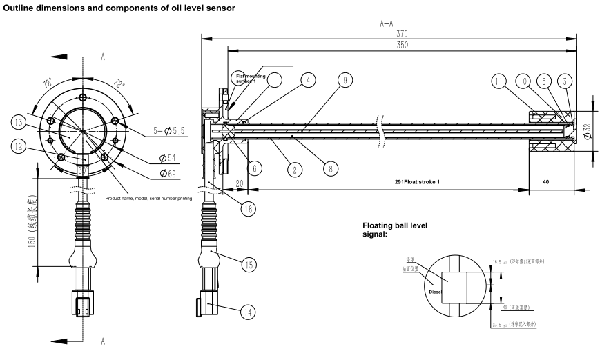 Sany straight rod type fuel level sensor